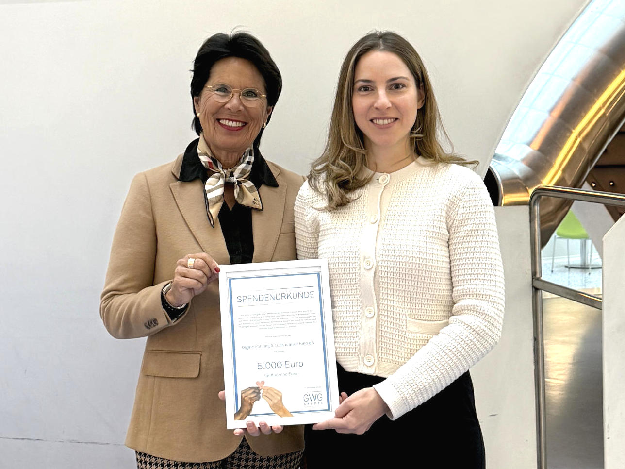Foto Spendenurkunde: Gabriele Mair li. (Vorstandsmitglied Olgäle-Stiftung), Marie Reinfurt re. (Pressesprecherin GWG-Gruppe)