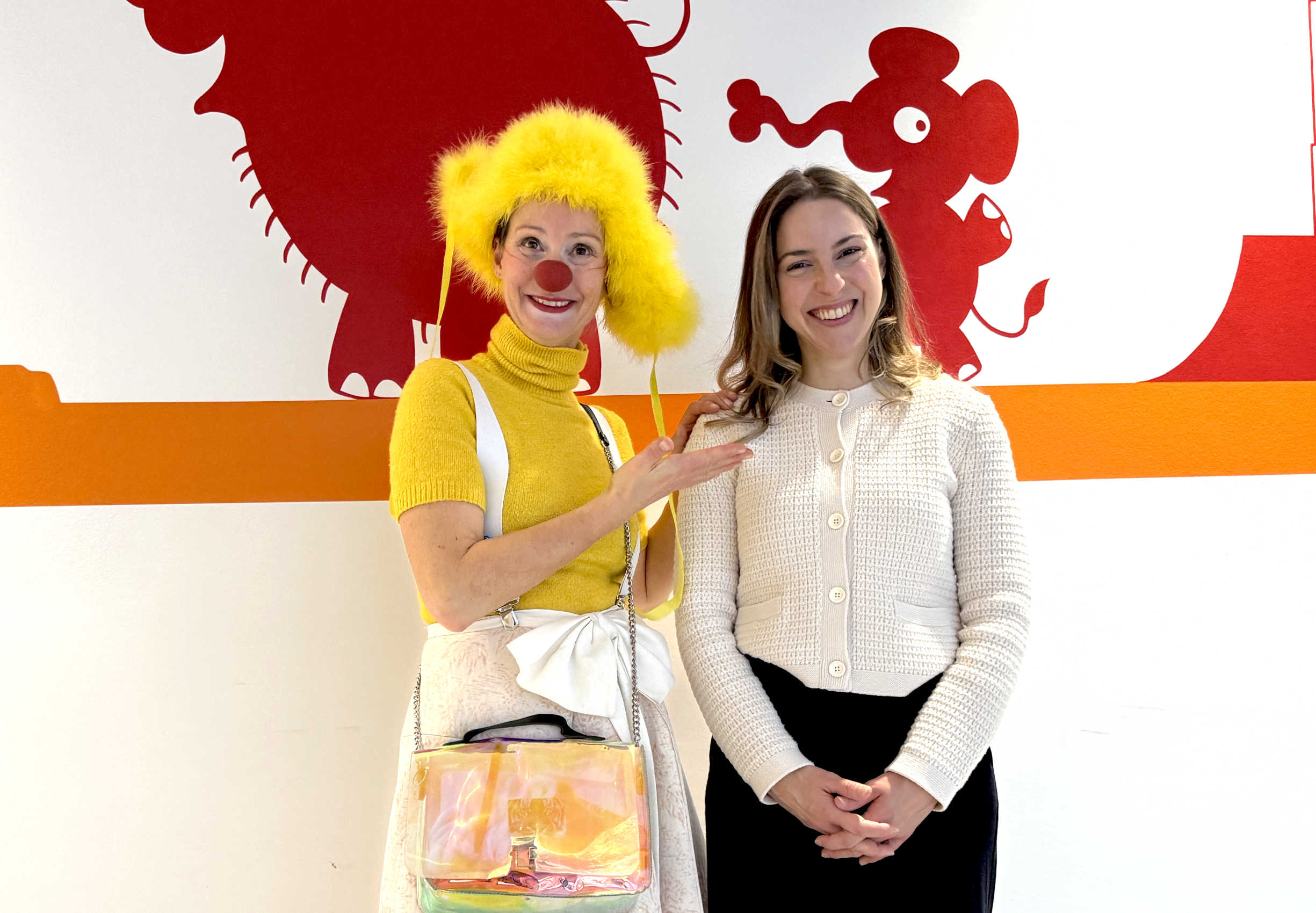 Gabriele Mair nahm beim persönlichen Besuch von Marie Reinfurt, Pressesprecherin der GWG-Gruppe, den Spendenscheck entgegen. Diese Hilfe freut alle Beteiligten, deren Herzensangelegenheit die Unterstützung von kranken Kindern ist – inklusive Klinikclown Camilla, die den Besuch noch bunter gemacht hat.