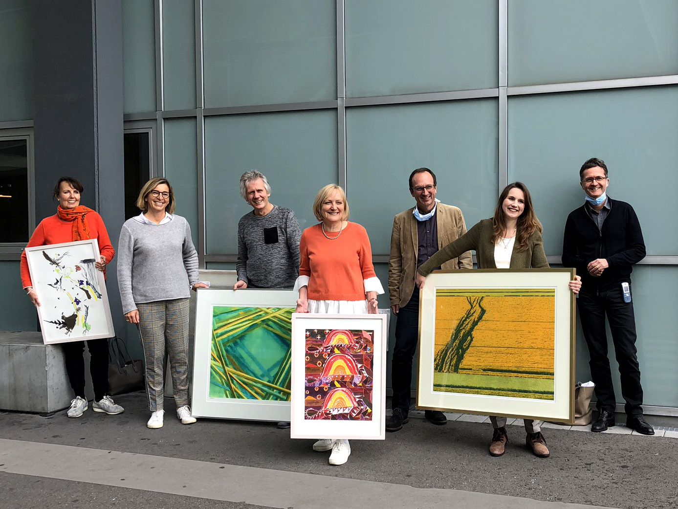 Der Deutsche Sparkassenverlag (DSV) spendete vor kurzem acht hochwertige zeitgenössische Druckgrafiken namhafter Künstler, darunter auch die Stuttgarter Künstlerin Isa Dahl, aus seinem Kunstbestand an die Olgäle-Stiftung für das kranke Kind e.V.. Die Stiftung dachte dabei gleich an die Klinikmitarbeiterinnen und -mitarbeiter auf den Stationen im Olgahospital und übersandte Beschreibungen der Kunstwerke an die Verwaltung zur Weiterleitung an die Mitarbeiterinnen und Mitarbeiter. Deren Rückmeldung ließ nicht lange auf sich warten: Fünf Stationen und zwar die Neuropädiatrie, die Neonatologie, die Kinderonkologie, die klinische Genetik sowie die Kinder- und Jugendpsychiatrie, waren sehr interessiert und wollten die bereits gerahmten Druckgrafiken sehr gerne für ihre Warte- und Aufenthaltsbereiche sowie Therapieräume, etc. im Olgahospital. Am vergangenen Montag war es dann soweit: Christiane-Valerie Gerhold vom DSV brachte die Kunstwerke persönlich zum Olgahospital und überreichte diese der Olgäle-Stiftung bzw. den Kunstbegeisterten. Die Beschenkten dankten sehr herzlich: „Wir freuen uns sehr, dass unsere Stationen durch diese wunderschönen Kunstwerke so aufgewertet werden. Beim Blick auf die Bilder können wir für einen kurzen Moment innehalten und vom Klinikalltag etwas entspannen und auch für die kleinen Patienten und ihre Familien können wir so die Atmosphäre im Olgahospital noch weiter verbessern.“