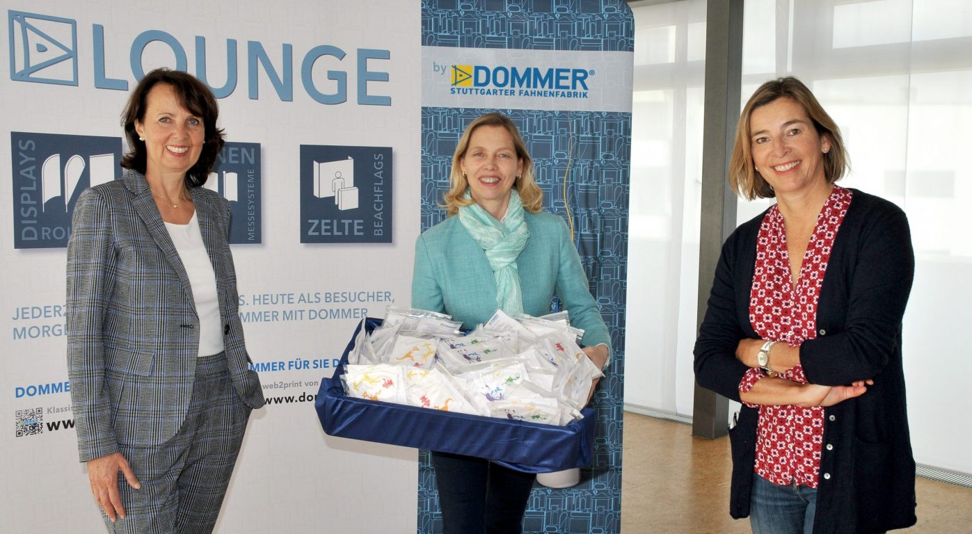 Die Firma Dommer Stuttgarter Fahnenfabrik übergab vor kurzem 250 Alltagsmasken und 50 Kindermasken an die Olgäle-Stiftung für das kranke Kind e.V. Die beliebten bunten Tierfiguren, die im Rahmen des damaligen Gestaltungswettbewerbs für die Innengestaltung des neuen Olgahospitals entwickelt wurden, schmücken nun druckfrisch die Masken der Stiftung. Felicitas von Hülsen, geschäftsführender Vorstand der Olgäle-Stiftung und Vorstandsmitglied Susanne Dieterich freuen sich sehr, dass die Stiftung nun ganz individuelle, unverwechselbare Stoffmasken hat und dankten Sylvia Dommer-Kroneberg, Geschäftsführerin der Dommer Stuttgarter Fahnenfabrik, sehr herzlich für ihr wiederholtes Engagement zugunsten der Stiftung sowie für die schöne Gestaltung und den perfekten Druck der Masken.