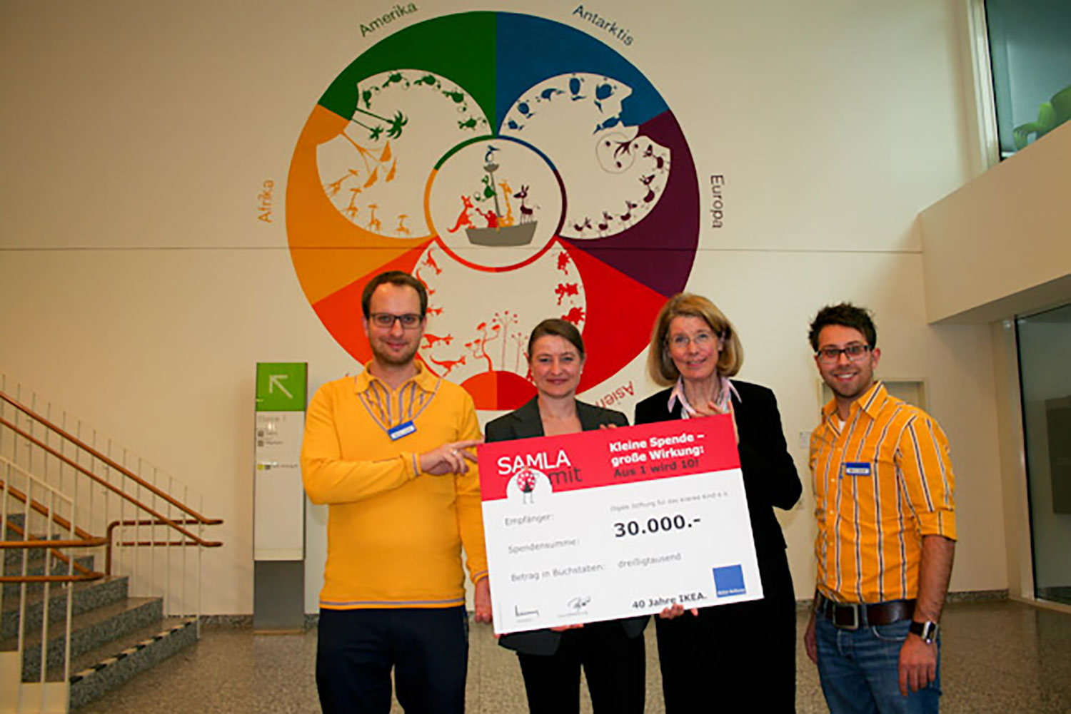 Die Idee war so einfach wie überzeugend: Anlässlich des 40. Geburtstags von IKEA Deutschland stellte die deutsche IKEA Stiftung Sammelboxen in allen 48 IKEA Einrichtungshäusern auf. Unter dem Motto „Kleine Spende – große Wirkung“ wurden die Kunden um einen kleinen Betrag gebeten, den die IKEA Stiftung nach Ablauf des Aktionszeitraum zu verzehnfachen versprochen hatte. Nun wurde Bilanz gezogen: Die vom 1. Oktober bis zum 15. November zusammen gekommenen Einzelbeträge der 48 IKEA Einrichtungshäuser wurden addiert, von der Stiftung zunächst verzehnfacht und anschließend großzügig auf eine Million Euro aufgerundet. Auch das IKEA Einrichtungshaus Sindelfingen hatte während des Aktionszeitraums fleißig gesammelt, die IKEA Stiftung verzehnfachte die eingegangenen Spenden jetzt und rundete den Betrag großzügig auf 30.000 Euro auf.