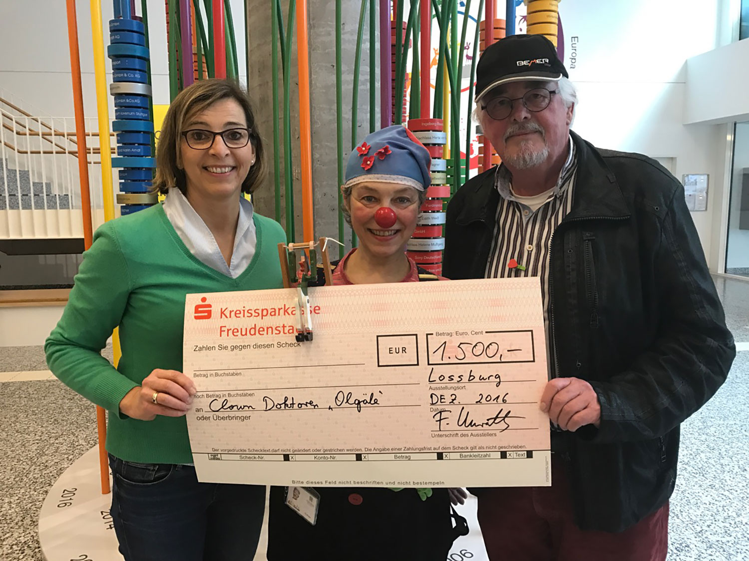 Bei der Spendenübergabe mit dabei war zudem “Frau Dr Klops“, eine der Klink-Clowns im Olgahospital. Ihre Ausbildung und Arbeit als Clownin wurde durch die Olgäle-Stiftung ermöglicht. So kann sie jeden Tag aufs Neue den Kindern und Familien ein Lächeln aufs Gesicht zaubern und manche Situation erträglicher gestalten: „Es ist ein tolles Gefühl, dass so viele Menschen bereit sind, unsere Arbeit mit Spenden zu unterstützen. Das sind Menschen, die unsere Arbeit wertvoll finden und sich vorstellen können, dass es etwas bewirkt. Ohne die Spender gäbe es uns eigentlich nicht.“