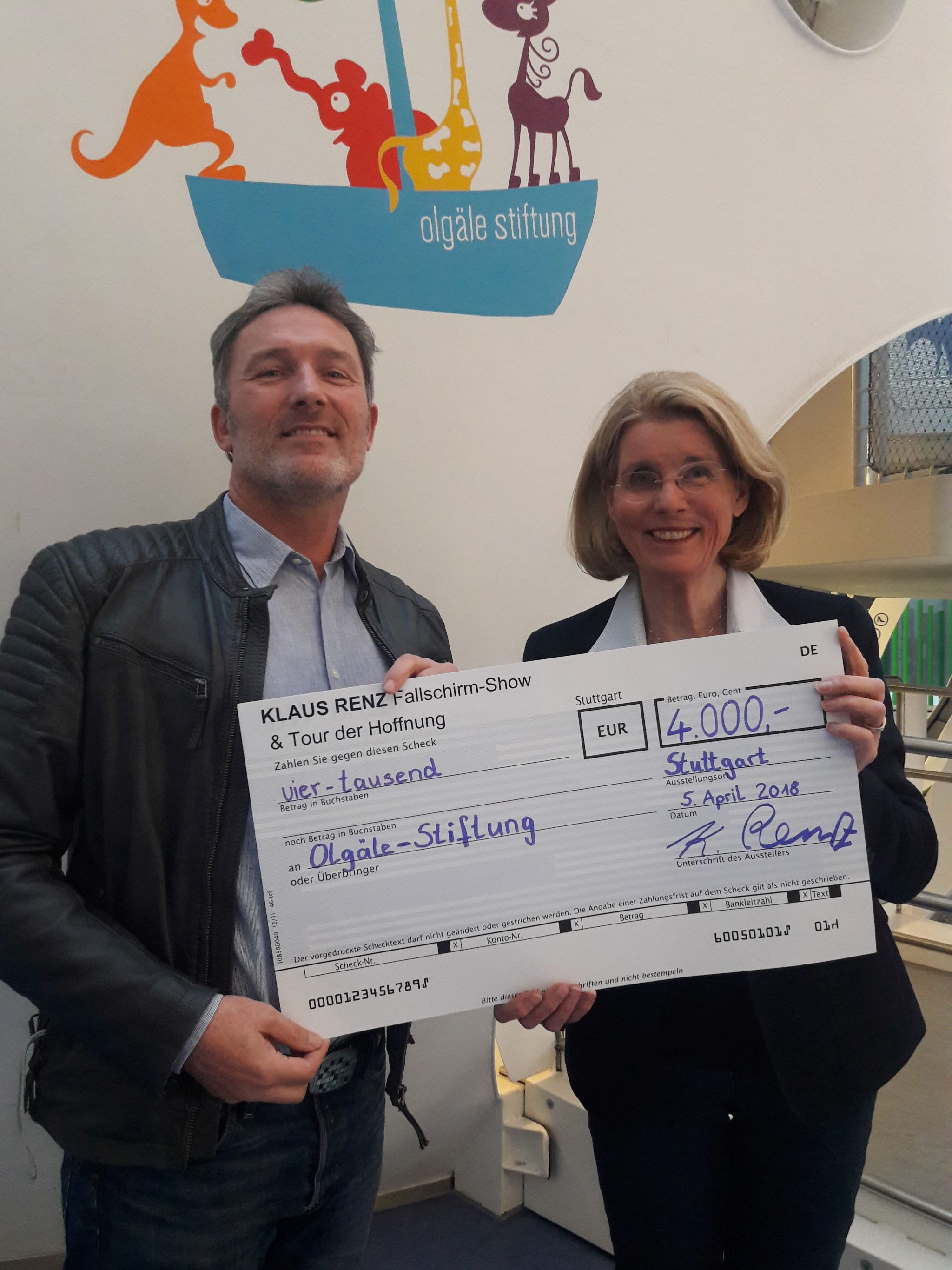 Die Spende ging nun an die Oläle-Stiftung und wurde von der „Tour der Hoffnung“ nochmals erhöht. Am 5. April 2018 durfte die Olgäle-Stiftung 4.000 Euro von Herrn Renz in Empfang nehmen. Dr. Stefanie Schuster, Präsidentin der Stiftung, nahm die Spende gerne im Namen der krebskranken Kinder entgegen. Auch mit dieser Spende kann viel Gutes getan werden, um den Aufenthalt im Olgäle etwas leichter zu gestalten.