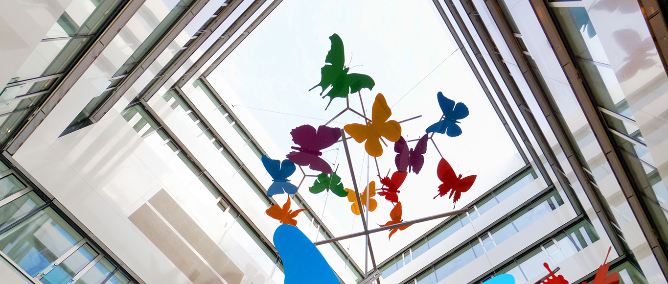 Eine wunderschöne Erinnerung an die viel zu früh verstorbene Künstlerin rosalie verbleibt in unserer Kinderklinik. Ein zauberhaftes, von ihr gestaltetes Schmetterlingsmobile schwebt durch einen der Lichthöfe des Olgahospitals. Es gehört zum kinderfreundlichen Gestaltungskonzept, das die Olgäle-Stiftung für den Neubau der Kinderklinik finanziert und realisiert hat. rosalie entwarf insgesamt 24 Schmetterlinge, die vom Dach des Innenhofes abgehängt sind. Diese in den sechs Farben unterschiedlich gestalteten Schmetterlingsarten sollen an die sechs Kontinente erinnern, die sich thematisch durch das gesamte Olgäle ziehen. Der höchste der aus lackiertem Edelstahl gefertigten Schmetterlinge schwebt 25 Meter über dem Boden des Innenhofs. Das wunderschöne Schmetterlingsmobile vermittelt den Kindern und Eltern sowie den Mitarbeiterinnen und Mitarbeitern ein Gefühl der Zuversicht, Leichtigkeit und Heiterkeit