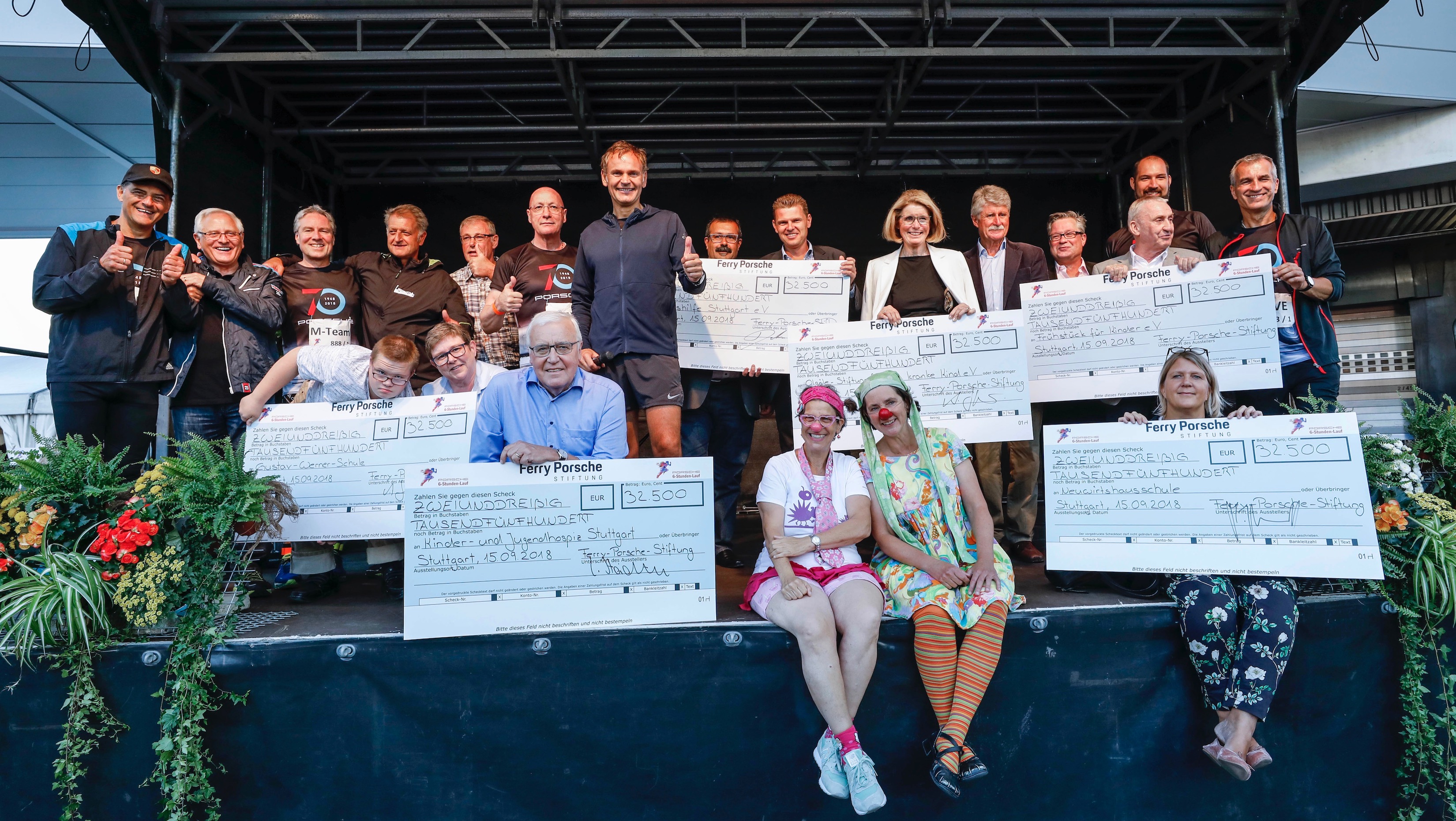 Für jede zurückgelegte Runde spendete die Ferry-Porsche-Stiftung fünf Euro an soziale Einrichtungen in der Region Stuttgart. Nach beachtlichen 26.415 Runden, die von 3.500 Porsche Mitarbeiterinnen und Mitarbeitern gelaufen wurden, erhielt auch die Olgäle-Stiftung eine Spende von 32.500 Euro, überreicht vom Gesamtbetriebsratschef der Porsche AG und stellvertretende Vorsitzende des Kuratoriums der Ferry-Porsche-Stiftung, Uwe Hück . Frau Dr. Schuster und Herr Irion-von Dincklage durften sich zusammen mit vielen Kindern hier im Olgäle Krankenkaus freuen und sagen Danke für dieses überragende Engagement.