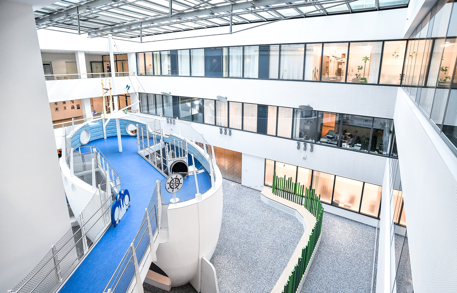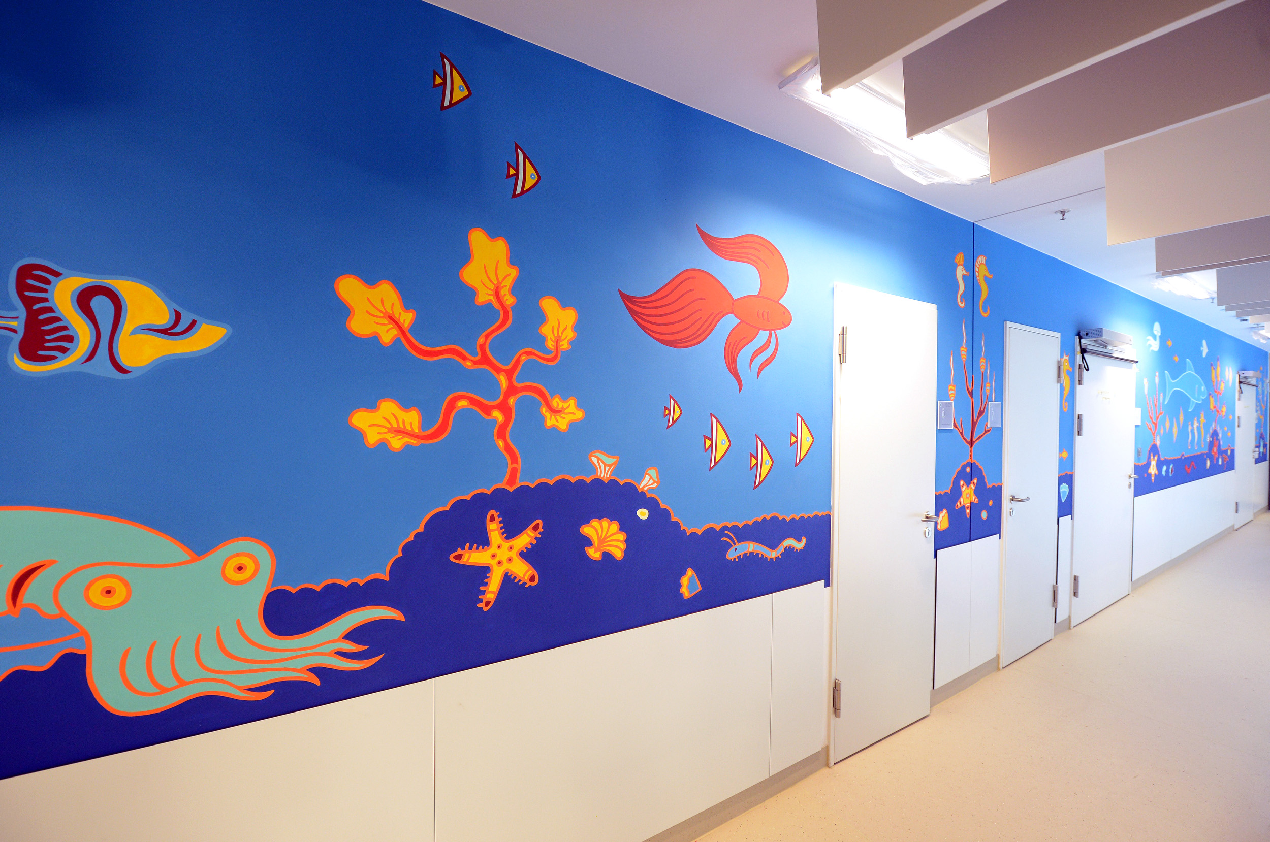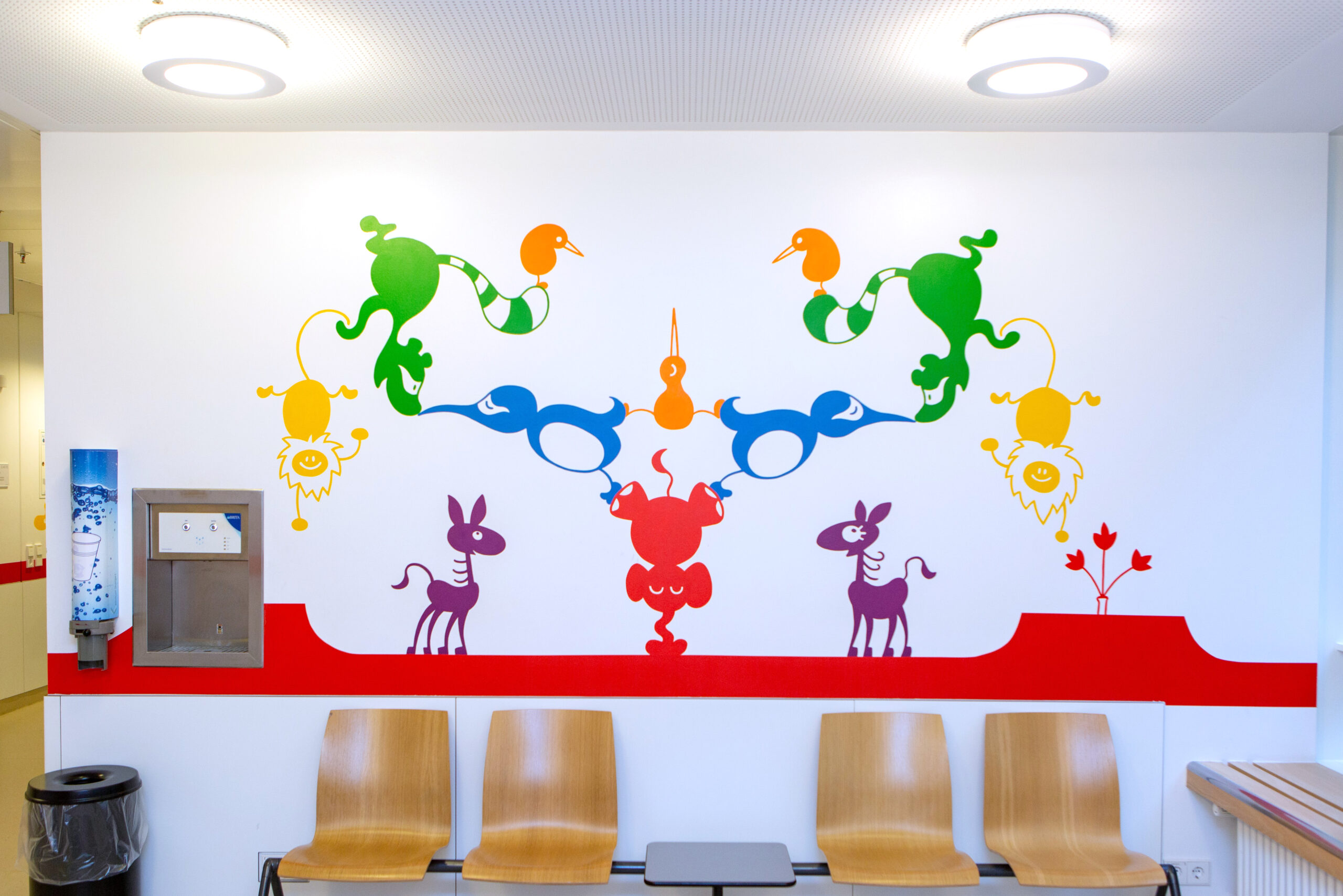 Die bunte, fröhliche Gestaltung des Olgahospitals schafft eine Atmosphäre, in der sich kleine Patienten und ihre Angehörigen wohl fühlen. Vor allem soll sie die Angst vor dem Klinikaufenthalt nehmen.