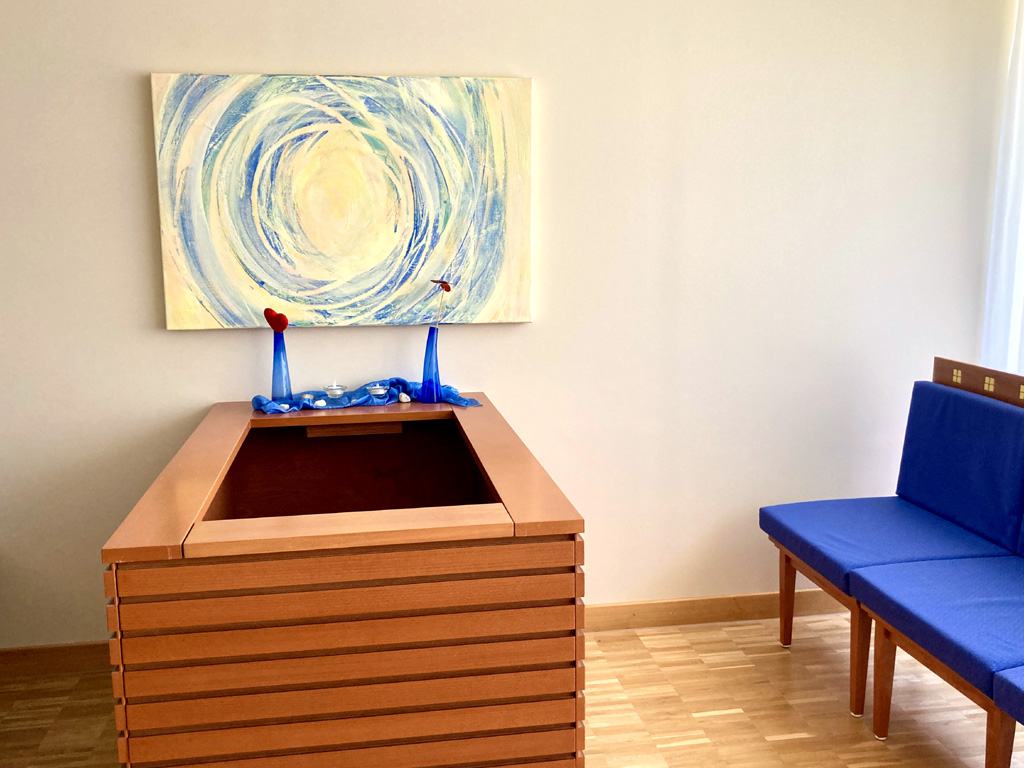 Leider kann nicht allen kranken Kindern geholfen werden. Die Olgäle-Stiftung hat deshalb für trauernde Angehörige einen hell gestalteten Abschiedsraum direkt vor Ort im Olgäle eingerichtet. Hier können sie in geschütztem Rahmen trauern und Abschied nehmen.