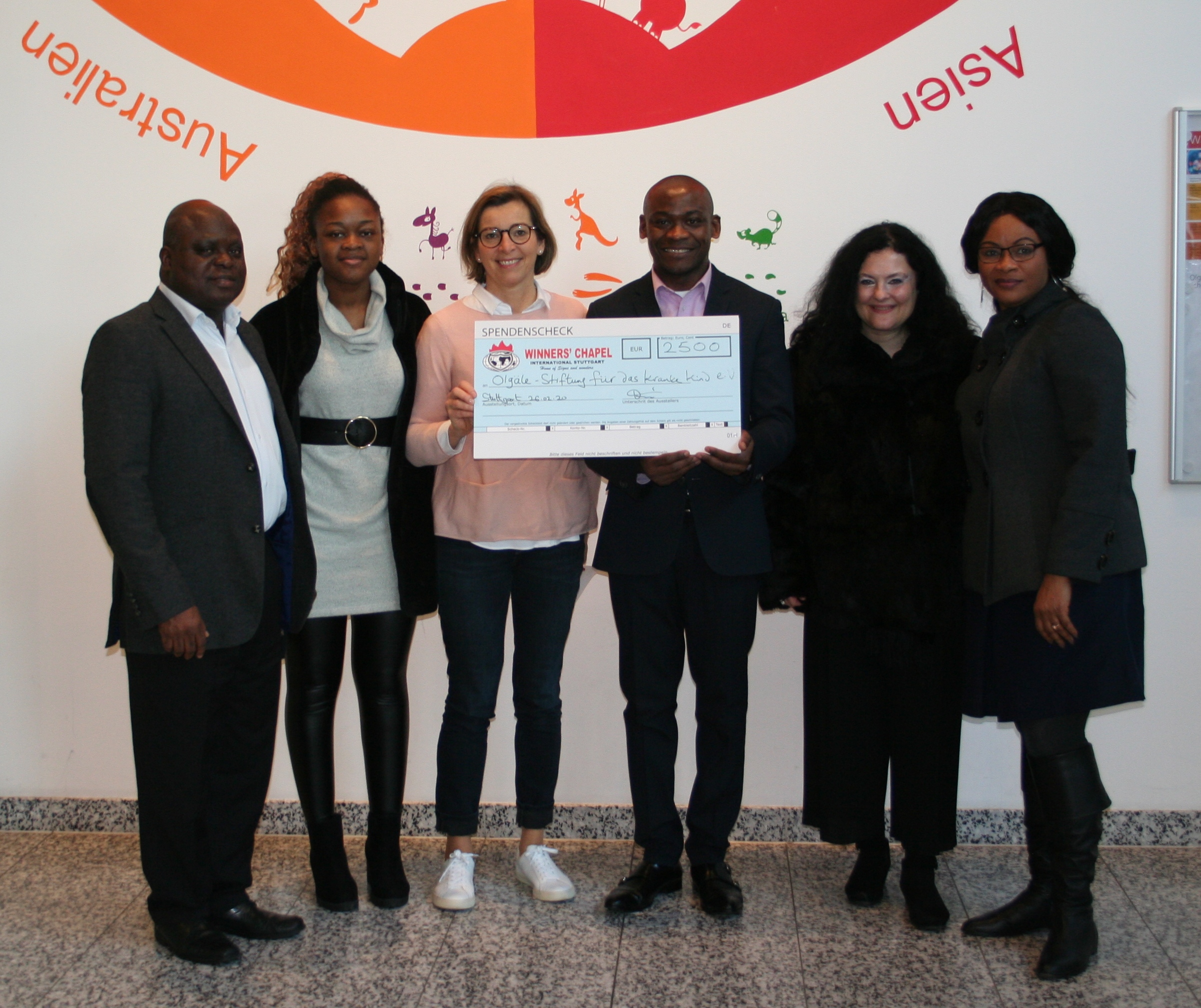 Eine Spende in Höhe von 2.500 Euro übergab die Freikirche „Winners Chapel International Stuttgart Germany e.V.“ dem Geschäftsführenden Vorstand der Olgäle-Stiftung, Felicitas von Hülsen. Jedes Jahr engagiert sich Winners Chapel für den guten Zweck, in diesem Jahr fiel die Wahl auf die Olgäle-Stiftung. Fünf Mitglieder der Kirche besuchten das Olgahospital und konnten sich vor Ort ein Bild von der Arbeit der Stiftung machen. Die Olgäle-Stiftung bedankt sich herzlich für die großzügige Spende für die kranken Kinder!